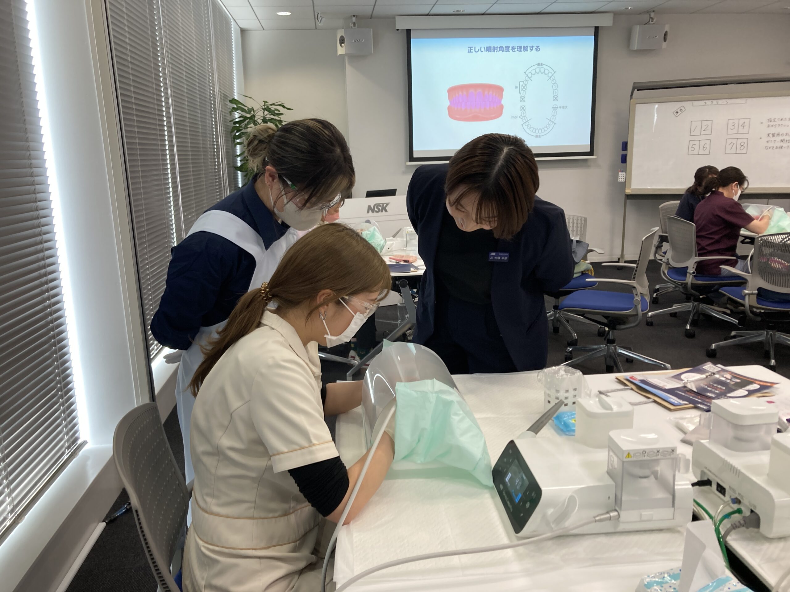 実習では、バリオスコンビProを一人1台使用し、適切な噴射角度や距離を学べます。また、ノズルチップを使用した歯肉縁下へのアプローチを体験できます。