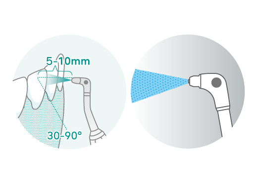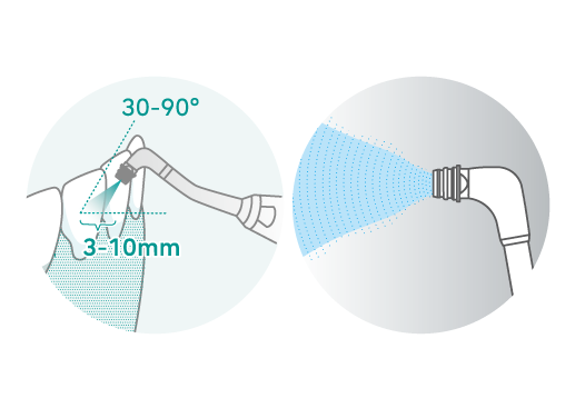 *露出した象牙質、エナメル質のう蝕、コンポジットレジン及び金の詰め物には直接噴射しないこと。[それらの表面に傷をつける恐れ]
