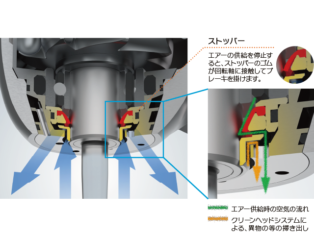 クイックストップは、エアー供給を停止するとストッパーのゴムが回転軸に接触して切削バーの回転を停止させる。また、クリーンヘッドシステムは、ヘッド部分の給気孔から浸入した口腔内の血液や異物などを排気圧を利用して瞬時に掃き出すシステムである(図1)。この両方のシステムよりサックバックが低減されている²) ³)。