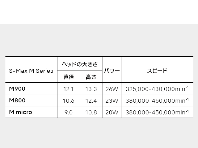 ①の場合は、速度・トルク・出力が高いものを選択して使用する傾向が強く、低回転速度でトルクの強いM900が第一選択になることが多い(図3)。しかし口腔内の狭い環境下では、M900のヘッドの大きさが視界を妨げたり、あるいは開口量が少なく切削操作が難しいことがある。そのような時にヘッドがM900と比較して直径で−1.5㎜、高さで−0.9㎜ 小さいM800を第二選択とすることがある。M800は回転速度がM900より速く、パワーが−3W(表1)である部分を回転スピードで補っており3X-Power Systemの効果で臨床的にはヘッドが小さくなってもトルクの不足を感じさせない。