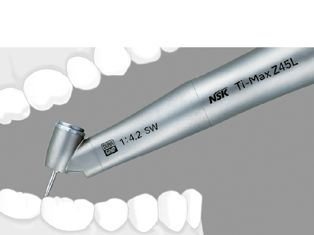 Ti-Max Z45Lは、これまでの一般的なハンドピースと異なり、ヘッド部45度の独自の形状をもつことから、視認性が向上。これまで届きにくかった大臼歯遠心部や前歯部口蓋側にバーを容易にアクセスさせることができ、精密・正確な施術が行える(図1)。