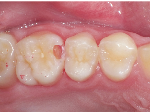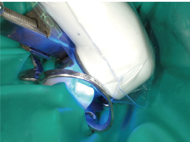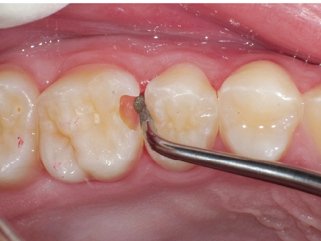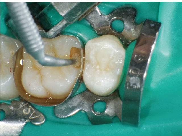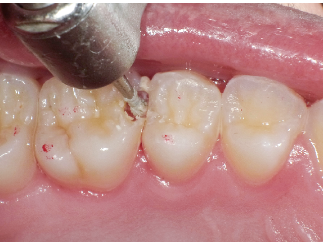 本症例では、ダイヤモンドの微粒子でコーティングされたエアースケーラーチップを窩洞形態の仕上げに使用。隣在歯の誤切削を防止し、エナメル質の切削断面を歯肉側窩縁までなめらかになるよう仕上げました。