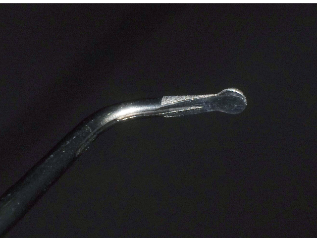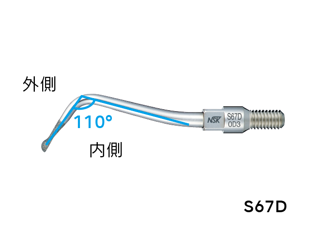 本チップは切削時にストレスが少ない穏やかな振動のエアースケーラー専用のダイヤモンドチップで、切削部となる半球形状の面にのみダイヤモンド砥粒がコーティングされており、背面平坦部は隣在歯を削らないよう平滑になっています(図8、9)。チップの屈曲角度は110°に設定され、窩洞へのアクセスが容易な形状となっています。S67D(アングルの外側)、S68D(アングルの内側)チップは半球状の切削部位が設定され、臼歯部の近遠心両側の窩洞形成に使用が可能です。本症例では、左上6近心隣接面部の窩洞であったため、アングルの外側に半球状の切削部位が設定されている「S67D」を使用しました。これらの器具を使用することにより、頬舌側の隅角部歯質を温存した最小限の規模で窩洞形成を終了、防湿操作および隔壁の設置に移行することができました。