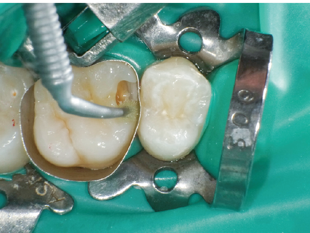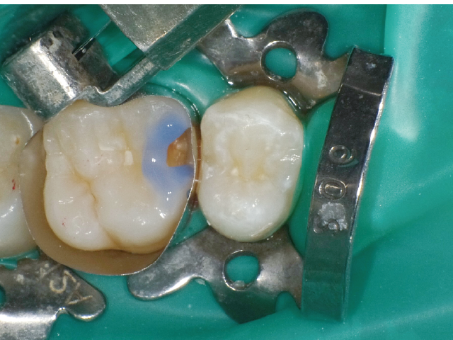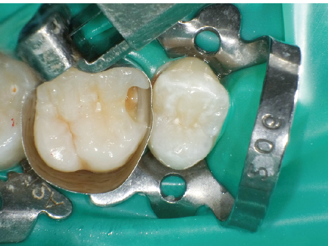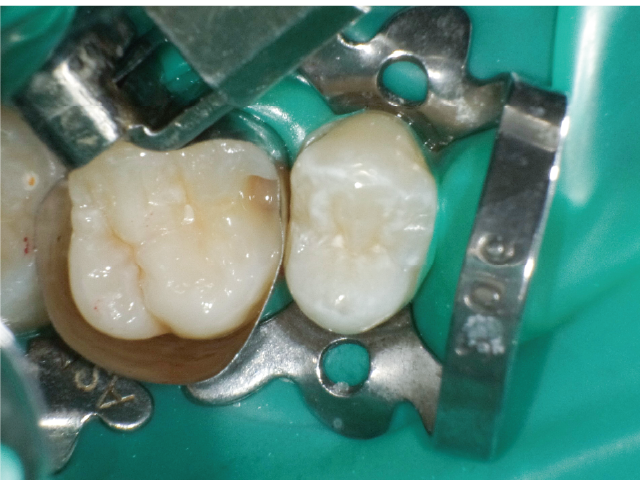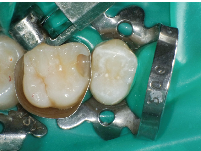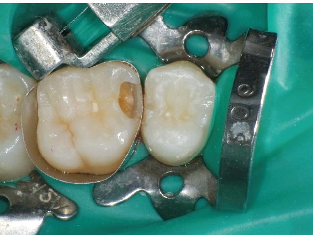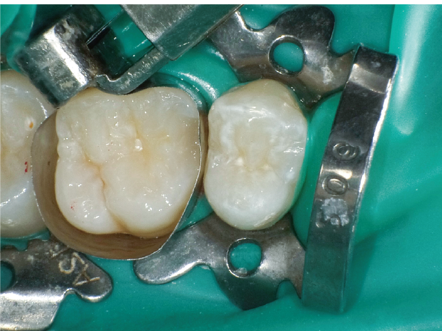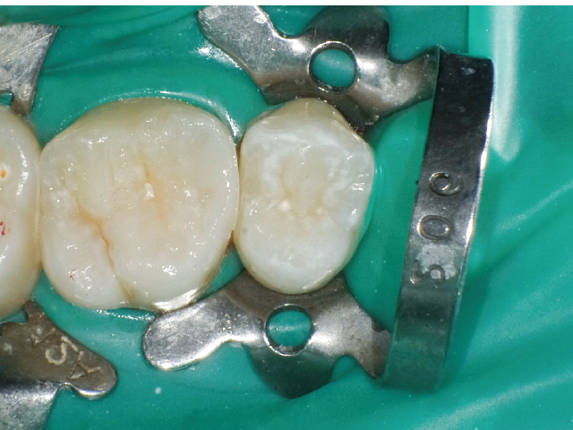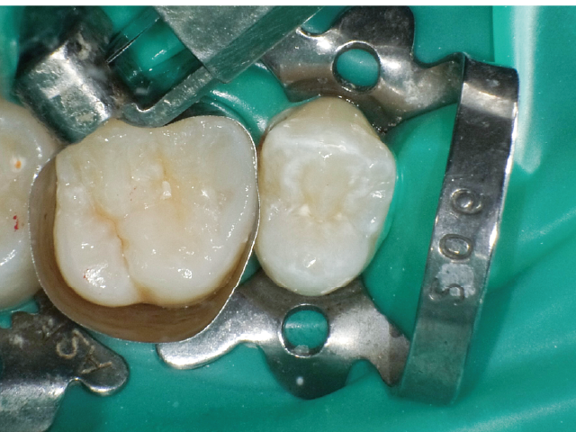 窩洞形成完了後は隣接面部健全歯質の残存範囲によりコンポジットレジンの充填時に用いるマトリックスシステムを選択していきますが、今回はシンプルな操作で設置可能なトッフルマイヤータイプのマトリックスシステムを選びました。隣在歯との距離が小さく、フラットな隣接面形態の再現が必要な症例には最適で、同時に精度の高い窩洞の防湿も可能です。使用したメタルのマトリックスバンドの厚さは30µmと非常に薄く、隣在歯との間に適切な接触関係を回復することができます。